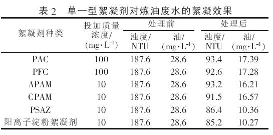 單一型絮凝劑對(duì)煉油廢水的絮凝效果如表2所示?
