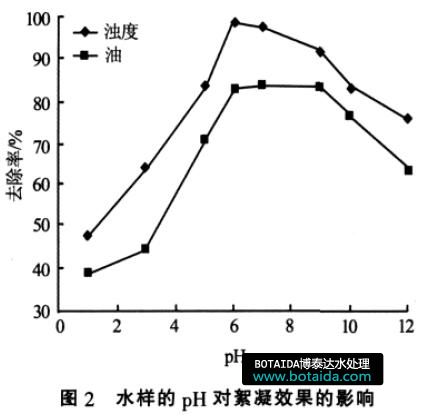 試驗(yàn)采取方法2 的投加順序, 通過改變水樣的pH 來考察其對(duì)絮凝效果的影響,結(jié)果見圖2?