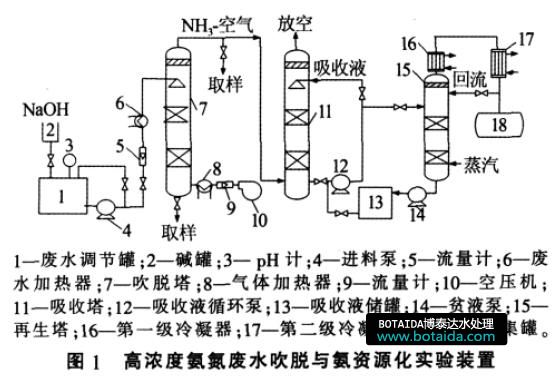 一定濃度的氨氮廢水在調(diào)節(jié)罐內(nèi)用固體NaOH調(diào)節(jié)pH 后,經(jīng)加熱器預(yù)熱后進(jìn)入吹脫塔頂部,經(jīng)預(yù)熱的空氣由吹脫塔底部進(jìn)入, 吹脫后的廢水由塔底排入收集瓶。吹脫塔頂出來(lái)的吹脫氣進(jìn)入吸收塔底部,在塔內(nèi)與塔頂進(jìn)入的氨吸收液進(jìn)行傳質(zhì),吸收后的吹脫尾氣由塔頂排出,吸收液循環(huán)使用。吸收液飽和后進(jìn)入再生塔進(jìn)行加熱再生, 再生后的吸收液回到吸收液儲(chǔ)罐循環(huán)使用; 再生塔出來(lái)的高濃度氨氣經(jīng)二級(jí)冷凝后可獲得質(zhì)量分?jǐn)?shù)為10%以上的氨水。