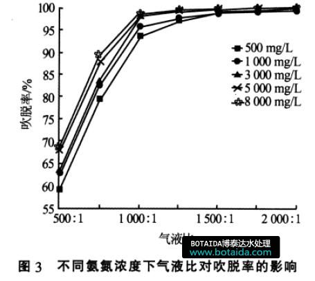由圖3 可知,氣液比小于1 000∶1 時(shí),不同氨氮濃度廢水的吹脫率均隨氣液比的增加顯著提高;但氣液比達(dá)到1 000∶1 時(shí), 氨氮質(zhì)量濃度≥3 000 mg/L以上的廢水吹脫率可達(dá)95%以上; 繼續(xù)提高氣液比,吹脫率增加緩慢;而氨氮質(zhì)量濃度<3 000 mg/L的廢水吹脫率接近95%,繼續(xù)提高氣液比至1 500∶1后,吹脫率可達(dá)95%以上且增加緩慢。這表明,氣液比超過(guò)1 000∶1 后, 進(jìn)水氨氮濃度對(duì)吹脫率影響不大。實(shí)驗(yàn)中為獲得95%以上的吹脫率,應(yīng)根據(jù)進(jìn)水氨氮濃度將氣液比控制在(1 000~2 000)∶1 的范圍。
