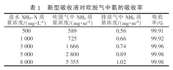 常溫常壓下,廢水吹脫氣液比為1 000∶1,復(fù)合酸吸收液流量約為12 L/h, 吸收液中有效組分質(zhì)量分?jǐn)?shù)為10%時(shí),新型吸收液對(duì)不同氨濃度吹脫氣的吸收率見(jiàn)表1。