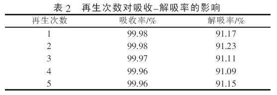由表2 可知,吸收液經(jīng)5 次吸收-解吸循環(huán),對(duì)氨吸收率均保持在99.9%以上, 解吸率均達(dá)91%以上,表明新型吸收液具有良好的可再生性。