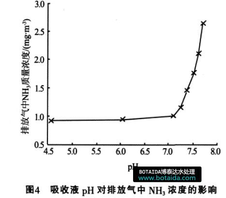 2.2.3 吸收液pH 對(duì)排放氣中氨濃度的影響常溫常壓下,當(dāng)氨氮初始質(zhì)量濃度為3 000 mg/L,氣液比為1 000∶1,吸收液流量約為12 L/h 時(shí),吸收液pH 對(duì)排放氣中氨濃度的影響見(jiàn)圖4。