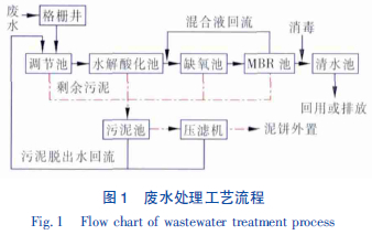 廢水先通過(guò)機(jī)械格柵除去較大的固體懸浮物。從格柵井流出廢水泵入調(diào)節(jié)池,以均勻水質(zhì),緩解水力沖擊負(fù)荷對(duì)后續(xù)工藝的影響。調(diào)節(jié)池出水進(jìn)入水解酸化池,水解酸化池出水依次進(jìn)入缺氧池和MBR 池,缺氧池的主要作用是進(jìn)行反硝化脫氮,從而去除廢水中的氨氮。MBR 集膜的高效分離和生物降解于一體,是將污水生物處理技術(shù)與膜分離技術(shù)相結(jié)合的新型污水處理工藝。其用膜組件代替了傳統(tǒng)活性污泥工藝中的二沉池,可進(jìn)行高效固液分離,達(dá)到水凈化的目的,克服了傳統(tǒng)工藝中出水水質(zhì)欠穩(wěn)定、污泥易膨脹等不足。生物反應(yīng)器內(nèi)保持較高的污泥濃度,硝化能力強(qiáng),污染物去除率高,部分混合液回流至缺氧池進(jìn)行反硝化去除氨氮。MBR 池出水進(jìn)入到清水池進(jìn)行消毒后,出水可回用或達(dá)標(biāo)排放。主要構(gòu)筑物尺寸及設(shè)計(jì)參數(shù)見(jiàn)表2。