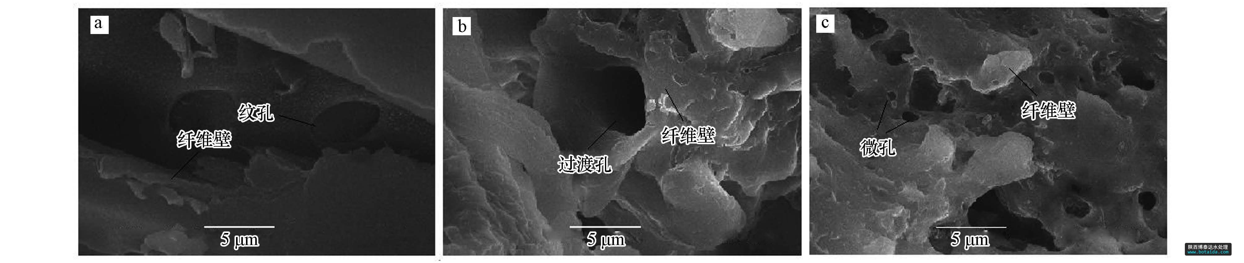 用JSM-6380LV掃描電鏡對原木粉、芐基化木粉、多微孔芐基化木粉進(jìn)行了分析(圖 4).對比原木粉(圖 4a)和芐基化木粉(圖 4b)發(fā)現(xiàn),原木粉中封閉的紋孔清晰可見,纖維壁堅(jiān)硬、平整.原木粉經(jīng)芐基化改性后(圖 4b),紋孔膜破裂,纖維壁膨松、柔軟,過渡孔清晰可見.芐基化木粉經(jīng)水熱處理后得到多微孔芐基化木粉(圖 4c),纖維壁明顯破裂,產(chǎn)生了許多微孔.這一方面是由于水蒸汽分子具有高能量、高穿透力,可將芐基化木粉纖維壁上的微纖絲部分沖破,并造成斷裂,產(chǎn)生新的微孔或超微孔(王瑀,2008);另一方面,在高熱水蒸汽分子沖擊下,芐基化木粉結(jié)晶區(qū)中纖維素的氫鍵斷裂,纖維分子從彎曲狀態(tài)變成伸展?fàn)顟B(tài),纖維壁伸展開來,產(chǎn)生了明顯的“膨化效應(yīng)”,有效地擴(kuò)大了芐基化木粉的過渡孔和微孔.此外,水熱處理中所加乳化劑OP-10能迅速乳化從纖維壁間釋放出的膠狀物質(zhì),有利于及時清洗疏通孔道.由此可見,木粉經(jīng)芐基化及水熱處理后,木材纖維壁變得膨松,產(chǎn)生大量的微孔或超微孔,有效地擴(kuò)大了芐基化木粉吸附重金屬離子的比表面積,同時使纖維素和半纖維素分子上的羥基更加裸露,增加了對重金屬離子絡(luò)合的羥基數(shù)目,從而提高了對重金屬離子的吸附性能.