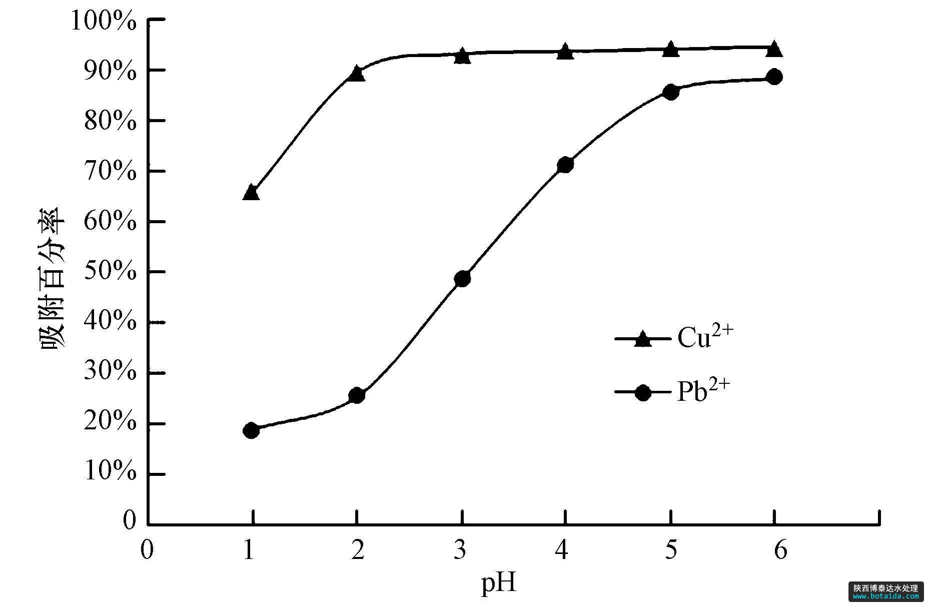 圖5 pH值對Cu2+和Pb2+吸附百分率的影響