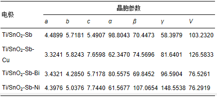通過(guò)XRD分析軟件(X′Pert highscore plus)對(duì)數(shù)據(jù)進(jìn)行分析(晉勇等,2008)得到各電極的晶胞參數(shù)見(jiàn)表 1,分析表中數(shù)據(jù)發(fā)現(xiàn),對(duì)Ti/SnO2-Sb電極進(jìn)行金屬摻雜改性后,晶胞參數(shù)發(fā)生改變,主要體現(xiàn)在晶胞體積的增大或減小,這是由于各金屬離子成鍵半徑不同,當(dāng)金屬離子以固溶或者類質(zhì)同相的形式取代Sn4+進(jìn)入SnO2晶格內(nèi)部,必然引起金屬氧鍵的鍵長(zhǎng)發(fā)生變化,從而造成晶胞參數(shù)的改變.XRD圖譜和晶胞參數(shù)等數(shù)據(jù)表明,通過(guò)金屬摻雜改性使金屬離子進(jìn)入到SnO2晶格中,其中,Cu和Ni以其p型半導(dǎo)體的性質(zhì)形成了空穴點(diǎn)位(劉淼等,2013),使電極表面形成較為密集的蜂窩狀,微觀結(jié)構(gòu)(圖 1)中也觀察到電極無(wú)裂縫且蜂窩狀結(jié)構(gòu)分布均勻,這樣的結(jié)構(gòu)可以增加電極的活性點(diǎn)位而提高電催化性能;而Bi則為n型半導(dǎo)體,與SnO2有著相似的性質(zhì),進(jìn)入SnO2晶格后主要通過(guò)增加自由電子的濃度來(lái)達(dá)到增強(qiáng)導(dǎo)電能力的效果.