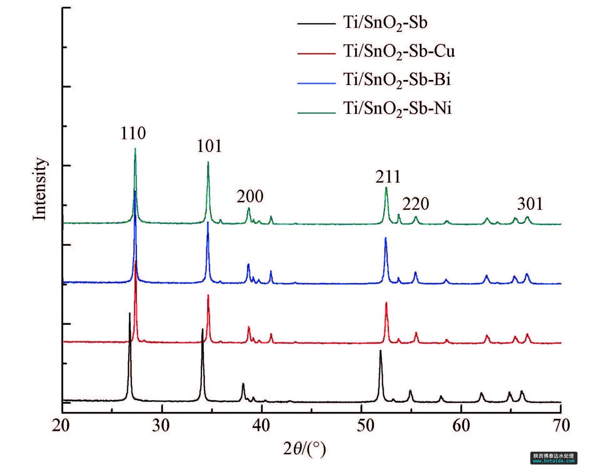 圖2 摻雜不同金屬Ti/SnO2-Sb電極XRD圖