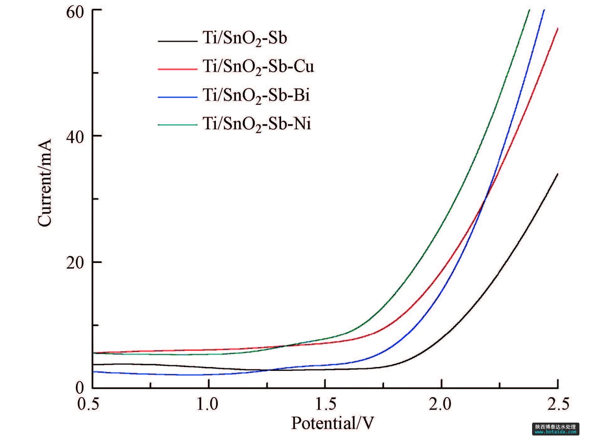利用CHI 760C電化學(xué)工作站測(cè)試電極的電化學(xué)性能,根據(jù)極化曲線考察摻雜不同金屬對(duì)Ti/SnO2-Sb電極析氧電位的影響,用恒電位下的電流-時(shí)間曲線反映電極的穩(wěn)定性,以循環(huán)伏安曲線考察電極催化性能.采用三電極體系:制備電極為工作電極、純鈦板為輔助電極、飽和甘汞電極為參比電極,在常溫25 ℃條件下,測(cè)定其在0.5 mol · L-1硫酸鈉溶液中的極化曲線,在恒電位(1 V)下測(cè)定電流與時(shí)間的關(guān)系曲線,并在0.5 mol · L-1 Na2SO4溶液和0.5 mol · L-1 Na2SO4+100 mg · L-1 1,4-二氯苯溶液中對(duì)改性Ti/SnO2-Sb電極進(jìn)行循環(huán)伏安測(cè)試.