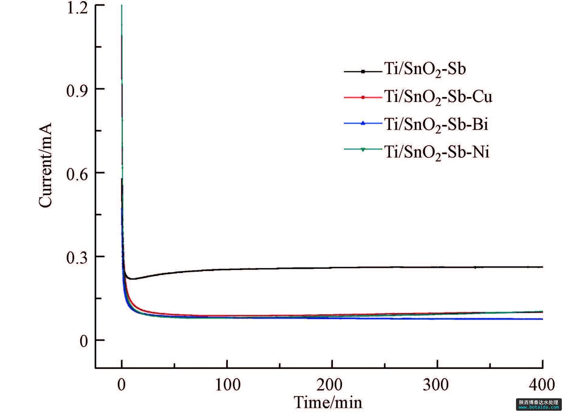 圖 4是4種改性電極在恒電位1.0 V下的電流-時(shí)間曲線,在1.0 V下,不會(huì)有析氧反應(yīng)發(fā)生,氧化電流歸因于電極材料的氧化.圖中0 min的較大電流是由于電極的雙層充電所致;在恒電位氧化400 min內(nèi),四種電極的氧化電流基本恒定,摻雜Cu、摻雜Bi、摻雜Ni氧化電流相近,明顯低于未摻雜電極氧化電流,這表明改性電極氧化速度比未改性的要小,可以推測(cè)改性電極性能衰減會(huì)更慢,具有較高的穩(wěn)定性.