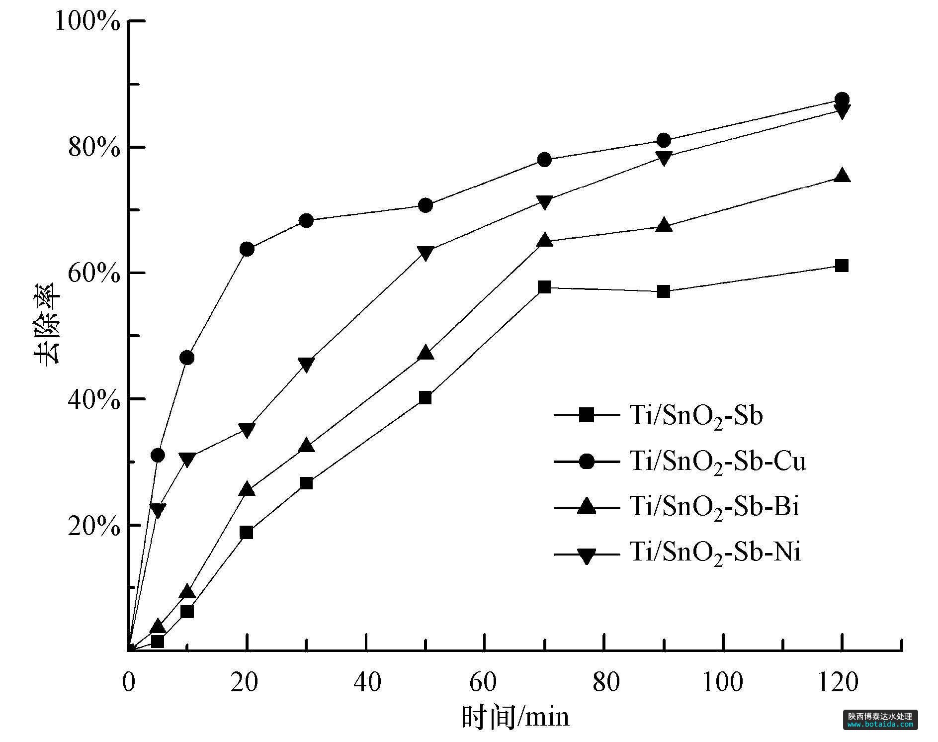 3)對(duì)p-DCB的電催化降解實(shí)驗(yàn)表明,與未改性的Ti/SnO2-Sb電極相比,摻雜金屬改性后的電極對(duì)p-DCB的降解效果更好,尤其是Ti/SnO2-Sb-Cu電極電催化性能最好,對(duì)p-DCB的降解效率也最高,電解2 h后p-DCB的去除率達(dá)到87.6%.