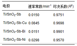 反應(yīng)速率常數(shù)越大說(shuō)明有機(jī)物的降解速率越快,從表中可以看出在相同條件下,p-DCB在各電極上的反應(yīng)速率常數(shù)由大到小依次為KTi/SnO2-Sb-Cu,KTi/SnO2-Sb-Ni,KTi/SnO2-Sb-Bi,KTi/SnO2-Sb.因此p-DCB在Ti/SnO2-Sb-Cu電極上的降解速率最快,在Ti/SnO2-Sb電極上的降解速率最慢,可見(jiàn)金屬元素的摻雜對(duì)p-DCB的降解起到了促進(jìn)作用。