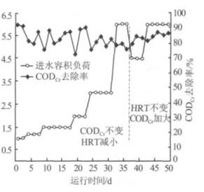 經(jīng)過(guò)近 40 d 的培養(yǎng)馴化,當(dāng)進(jìn)水 CODCr 為 1 100 mg/L,HRT 為 24 h 時(shí) ,CODCr 去 除 率 穩(wěn) 定 在 92% 左右,進(jìn)入運(yùn)行特性試驗(yàn)階段,該過(guò)程分 2 個(gè)階段提高進(jìn)水容積負(fù)荷 。 CODCr 去除率隨進(jìn)水容積 負(fù)荷的變化情況見(jiàn)圖 2。