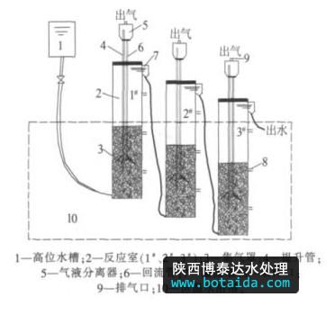 試驗(yàn)裝置如圖 1 所示 ,MICR 由 3 根 D 80 mm× 1 000 mm 的有機(jī)玻璃管串聯(lián)而成,總有效容積為 12.81 L,分為 1#、2#、3# 反應(yīng)室。各反應(yīng)室均設(shè) 3 個(gè)孔徑為 8 mm 的取樣口,取樣口分別位于距離 反應(yīng)室底部 100、350、700 mm 處,并用恒溫水浴槽控制試驗(yàn)溫度為(35±1 ) ℃。 廢水從高位槽向 1# 反應(yīng)室底部注入,然后由上部出水口經(jīng)溢流堰順管道進(jìn)入 2# 反應(yīng)室底部,依次推進(jìn),經(jīng)過(guò) 3# 反應(yīng)室之后排出 。各反應(yīng)室的氣體在集氣罩下方匯集,以泥水混合液的形式經(jīng)提升管進(jìn)入氣液分離器,氣體從排氣口排出,泥水混合液經(jīng)回流管回流至反應(yīng)室底部,形成液體內(nèi)部循環(huán) 。