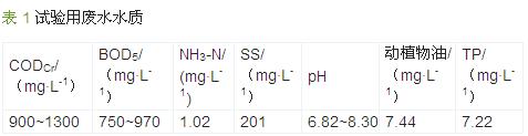 試驗(yàn)所用乳品廢水取自廣西皇氏甲天下乳業(yè)股份有限公司 ( 主要水質(zhì)參數(shù)見(jiàn)表 1 ),并根據(jù)需要添加了適量純牛奶,以提高 CODCr,以尿素為氮源 、磷酸二氫鉀為磷源,保持 m (CODCr) ∶ m (N) ∶ m (P) = 300 ∶5∶1 。為促進(jìn)污泥馴化,適量添加含有 Fe、Ca、 Mn、Zn、Co、K 等微量元素的營(yíng)養(yǎng)液。