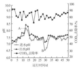 圖 3 進(jìn)、出水 pH 及 CODCr 去除率隨運(yùn)行時(shí)間的變化