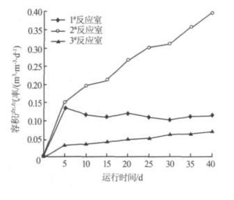 由圖 6 可見(jiàn),2# 反應(yīng)室產(chǎn)生的 CH4 最多,容積產(chǎn)氣率 >0.153 m3/(m3· d),最高達(dá) 0.397 m3/(m3· d),并隨著容積負(fù)荷的 增加而增大 ( 隨運(yùn)行時(shí)間延長(zhǎng)容積負(fù)荷增加 ),表明 2# 反應(yīng)室以產(chǎn)甲烷菌為主。 1# 反應(yīng)室產(chǎn)生的 CH4 量受進(jìn)水容積負(fù) 荷的影響不大 ,總體保持在 0.103~ 0.137 m3/(m3· d) 的水平 ,表明 1# 反應(yīng)室主要起水解和酸化作用 ,以產(chǎn)酸菌為主,產(chǎn)甲烷菌的活性受到抑制 ,而且受進(jìn)水容積負(fù)荷的直接沖擊,CH4 產(chǎn)量呈現(xiàn)小幅度的波動(dòng) 。 3# 反應(yīng)室與 2# 反應(yīng)室一樣 ,產(chǎn) CH4 量隨著容積負(fù)荷的增加而增大 ,但 產(chǎn) CH4 量 始 終 很 低 ,其 容 積 產(chǎn) 氣 率 最 大 為 0.071 m3/(m3· d),表明 3# 反應(yīng)室也以產(chǎn)甲烷菌為主 ,但由于廢水流至 3# 反應(yīng)室時(shí)剩余的有機(jī)物很少 ,底物不足,因此 CH4 量很少 。