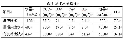 某電子公司是國內(nèi)重點集成電路封裝測試企業(yè),該公司主要從事半導體集成電路、半導體元器件的封裝測試業(yè)務(wù),其生產(chǎn)線廢水主要包括兩部分,一部分為晶元的減薄劃片廢水、另一部分為電鍍錫化廢水。減薄劃片廢水中主要含有大量的硅粉微粒,SS約2000mg/L左右,特性很穩(wěn)定,不易沉降,電導率僅為2-4µs/cm,東洋采用自主研發(fā)的二級連續(xù)UF膜系統(tǒng)進行進行廢水回收利用,廢水回收利用率≥90%,回收水質(zhì)好,同時回收硅粉。在此主要介紹電鍍錫化廢水的回用處理系統(tǒng);廢水中主要含有Cu、Sn、酸堿、有機物等,在該項目中首先要做好分質(zhì)分流是尤為重要,把錫化電鍍線上的廢水按照水中的成份及濃度來分質(zhì)收集,主要分為漂洗廢水、重污染廢水、有機槽廢液三路,水質(zhì)如下: