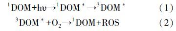 溶解性有機(jī)質(zhì)(DOM)含有發(fā)色基團(tuán),是重要的天然光敏劑,在紫外輻射或太陽光照射下,單線態(tài)(state DOM singlet,1DOM)分子吸收光能先轉(zhuǎn)化為激發(fā)單線態(tài)(excited state DOM singlet,1DOM*),進(jìn)而轉(zhuǎn)化為激發(fā)三線態(tài)(excited state DOM triplets,3DOM*),進(jìn)一步與溶解氧分子發(fā)生一系列反應(yīng),產(chǎn)生活性氧物質(zhì)(reactive oxygen species,ROS),如羥基自由基(hydroxyl radical,· OH)、單線態(tài)氧(singlet oxygen,1O2)、超氧化物(superoxide,O2-)等(見反應(yīng)式(1)、(2.這些活性氧物質(zhì)可以誘導(dǎo)有機(jī)污染物光降解,同時(shí),DOM也會與目標(biāo)化合物競爭光吸收,或猝滅目標(biāo)化合物的激發(fā)態(tài),DOM對有機(jī)污染物的光解具有光敏化和光屏蔽雙重作用(Chen et al., 2009;,這與DOM的來源、組成、化學(xué)結(jié)構(gòu)等特點(diǎn)密切相關(guān).因此,溶解性有機(jī)質(zhì)在水生生態(tài)系統(tǒng)光化學(xué)中扮演重要角色,可以影響有機(jī)污染物的環(huán)境行為和生態(tài)風(fēng)險(xiǎn).