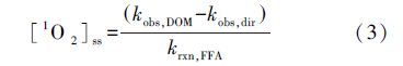 一般采用單線態(tài)氧平衡濃度(singlet oxygen steady-state concentrations,[1O2]ss)對腐殖酸產(chǎn)生1O2的產(chǎn)量進(jìn)行表征.FFA作為對1O2的捕獲劑,其降解的快慢可以反映產(chǎn)生1O2的速率.[1O2]ss可由FFA降解速率常數(shù)kobs,DOM和FFA自身光降解速率常數(shù)kobs,dir經(jīng)公式(3)計(jì)算得到.