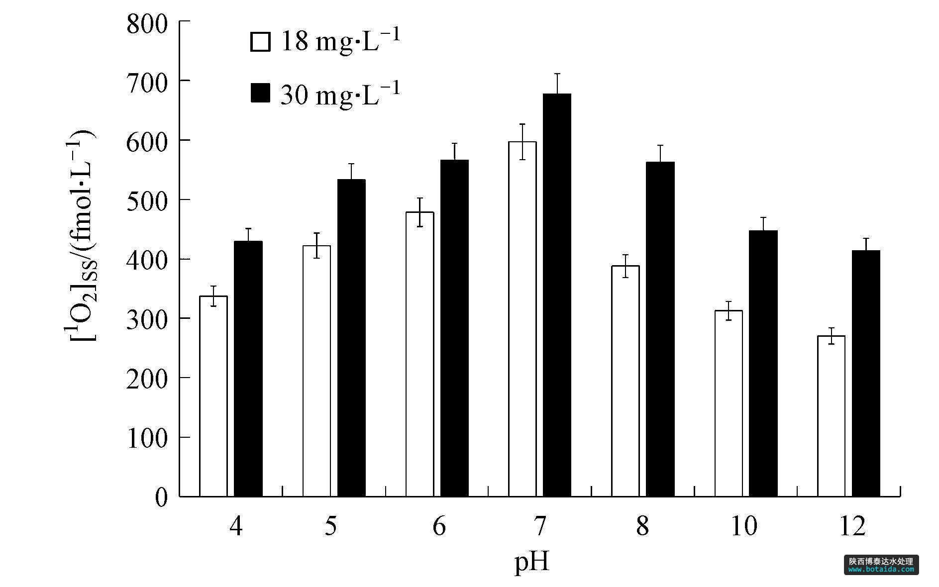 pH作為水環(huán)境中重要的理化性質(zhì)指標(biāo),對水中DOM的水化學(xué)、光化學(xué)等行為的解釋和預(yù)測具有重要作用(Frimmel et al., 1987; Dalrymple et al., 2010).圖 2為不同pH條件下,腐殖酸光敏化產(chǎn)生1O2的平衡濃度. [1O2]ss 值在pH=7的溶液中最高,其中DOC值為18 mg · L-1和30 mg · L-1的腐殖酸溶液產(chǎn)生的[1O2]ss分別為596.9 fmol · L-1和677.3 fmol · L-1.隨著酸堿性增強(qiáng),[1O2]ss值逐漸減小,但弱酸環(huán)境中的[1O2]ss值較弱堿環(huán)境中的高.
