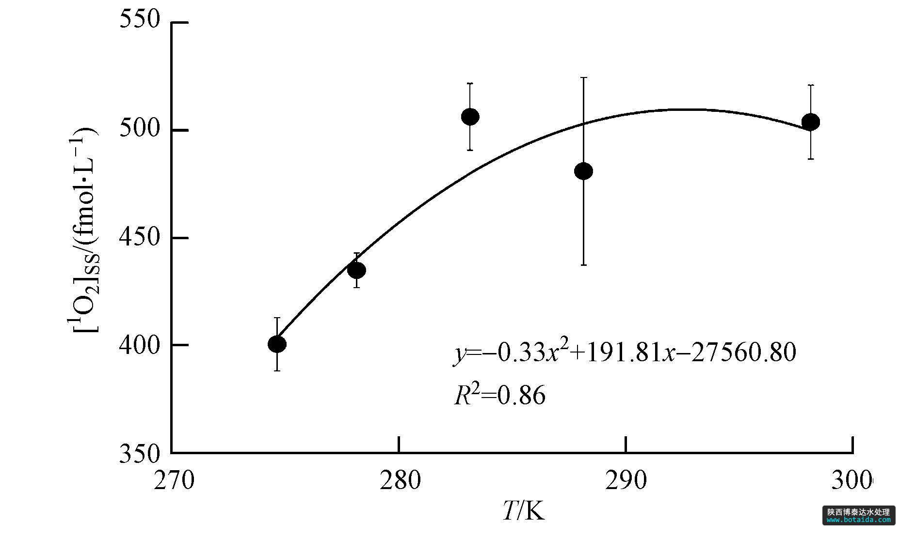 為模擬實(shí)際水環(huán)境,本研究所選溫度段為1.5、5、10、15和25 ℃,[1O2]ss與T(T為絕對溫度)的關(guān)系如圖 4所示.實(shí)驗(yàn)溫度范圍內(nèi),[1O2]ss值為400~506 fmol · L-1,隨T增大呈增長趨勢.分析推測溫度升高,溶液中分子活躍度增強(qiáng),使得HA吸收光子能量發(fā)生能級躍遷生成三線激發(fā)態(tài)(3HA*)的速率增大,使得更多的氧分子獲得3HA*轉(zhuǎn)移的能量形成1O2.