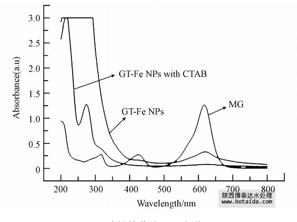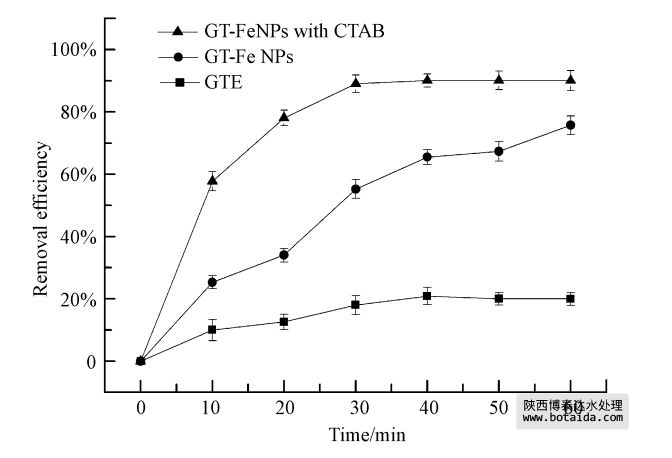 圖 5 GTE、GTE合成Fe NPs和CTAB存在時(shí)GTE合成的Fe NPs 對MG的去除
