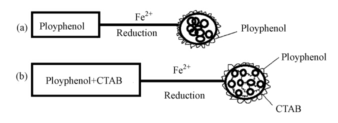 用植物提取液合成納米金屬主要是通過植物提取液中的有機(jī)成分如多酚等為還原劑還原金屬鹽,GTE中多酚可作為還原劑還原亞鐵鹽制備Fe NPs(Njagi et al., 2011; Shahwan et al., 2011; Kharissova et al., 2013; Mittal et al., 2013). GTE合成Fe NPs和CTAB作用下GTE合成Fe NPs可能的機(jī)理如圖 6所示. 陽離子表面活性劑CTAB存在時(shí),由于CTAB吸附在納米顆粒表面導(dǎo)致納米鐵帶電荷,納米顆粒之間的斥力作用使得合成的納米顆粒更加分散,從SEM、XRD、FTIR和UV-vis等的表征結(jié)果也可證實(shí)CTAB的包覆使得合成的納米鐵更加穩(wěn)定.