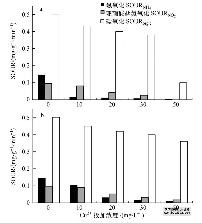 圖 4 Cu2+投加濃度對SOUR的影響(a.抑制穩(wěn)定期SOUR;b.恢復末期SOUR)