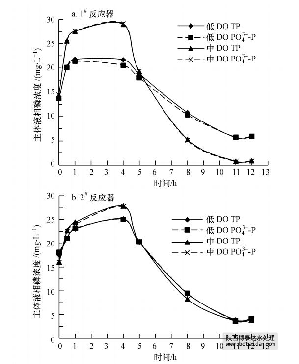 由圖 2可以看出,不同SRT和DO條件下反應(yīng)器主體液相磷濃度的變化均表現(xiàn)為厭氧升高、好氧降低,說明兩組A/O-SBR系統(tǒng)具有良好的生物強化除磷(EBPR)性能,聚磷菌(PAOs)獲得生長競爭優(yōu)勢.反應(yīng)器進水磷源為KH2PO4,反應(yīng)過程中液相的PO3-4-P濃度占TP濃度的95%以上,說明污泥絮體厭氧釋放和好氧吸收的磷主要為PO3-4-P.