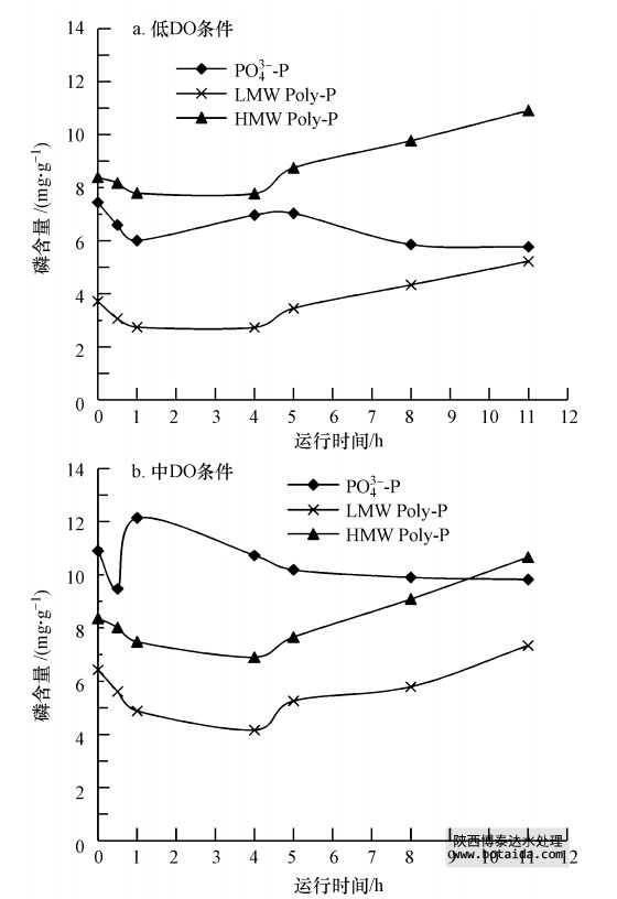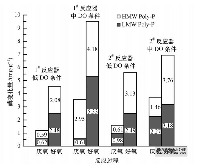 3)EPS不僅是生物除磷過程的中轉(zhuǎn)站,而且參與了生物聚磷過程.EPS的LMW Poly-P和HMW Poly-P含量均表現(xiàn)厭氧降低和好氧升高的變化規(guī)律;對于相同SRT的污泥,中DO(2.5~3.5 mg · L-1)條件較低DO(0.7~1.0 mg · L-1)條件下EPS的LMW Poly-P和HMW Poly-P有更大的厭氧降低量和好氧升高量,對應(yīng)著更明顯的生物除磷過程.