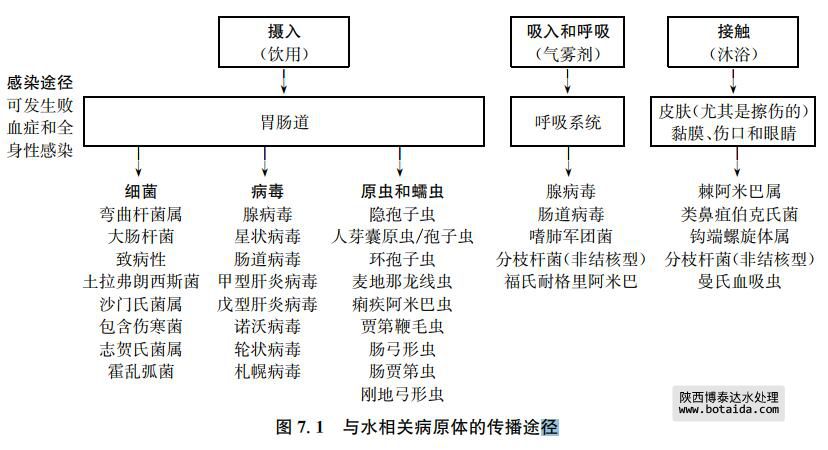 能在自然環(huán)境中存在的其他病原體可能導(dǎo)致那些易感人群引發(fā)疾病,如老人或幼兒、燒 傷或有大面積創(chuàng)傷的病人、接受免疫抑制療法或是獲得性免疫缺陷綜合癥(艾滋?。┗颊?。 如果這些人飲用或沐浴的水中含有足夠數(shù)量的這種病原體,就可引起各種皮膚和眼、耳、鼻、 喉黏膜感染。這些病原包括銅綠假單胞菌、黃桿菌屬、不動桿菌、克雷伯氏菌、沙門氏菌、氣 單胞菌和某些“生長緩慢”的非結(jié)核性分枝桿菌等(見附錄1支持文件《水中的病原分枝桿 菌》)。表7.2列出了一些這種生物體(更多詳細(xì)內(nèi)容請參見第11章)。