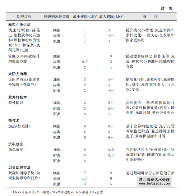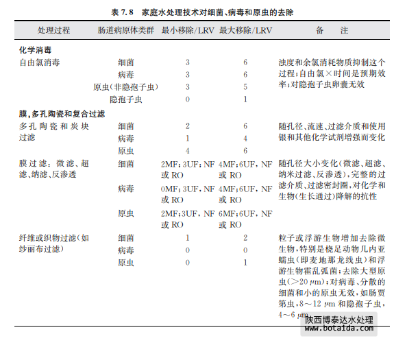 表7.8總結(jié)了采用上述幾種家庭水處理技術(shù)對水傳播細(xì)菌、病毒和寄生性原生蟲的 去除情況。這些去除信息是基于科學(xué)文獻(xiàn)報告的研究結(jié)果。有兩個有效性內(nèi)容:基本去 除和最大去除?;救コ侵赣上鄬Σ皇炀毴藛T實際操作時的一般運行效果,且操作人 員將以上方法用于處理平均水質(zhì)或可變水質(zhì)原水及現(xiàn)場只有很少應(yīng)用工具以優(yōu)化處理條 件和操作時。最大去除是指在熟練操作和優(yōu)化運行條件下,并且在可預(yù)見和不變水質(zhì)條 件下,有相關(guān)儀器工具支持并保持最高水平運行時達(dá)到的效果(如測試一個已知濃度和種 屬的微生物時)。應(yīng)當(dāng)該注意的是某些水處理工藝的lg減少值存在差異,如表7.8中的 家庭水處理和表7.7中的集中處理。這種相同處理技術(shù)、不同的運行效果差異是可以理 解的。因為集中處理所用水通常滿足處理工藝所需要的質(zhì)量,而且處理過程由訓(xùn)練有素的操作人員使用,工藝經(jīng)過合理的設(shè)計并有良好的運行控制系統(tǒng)。相反,家庭水處理通常 水質(zhì)變化較大,也沒有得到最好的運行技術(shù)優(yōu)化。相對于管理集中處理設(shè)施的人員,處理 過程也常常得不到專業(yè)人員的專業(yè)運行控制。這些處理過程的進一步細(xì)節(jié),包括運行影 響因子和表7.8中提供的lg減少值水平基礎(chǔ),可見附錄1支持性文件《家庭水管理和家庭 水處理選擇評估》。陜西博泰達(dá)水處理為您提供服務(wù)。