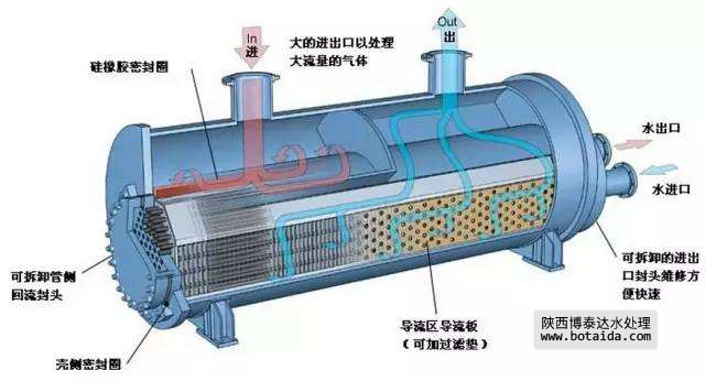 ② U形管式換熱器:它只有一塊管板,因此管子在受熱或冷卻時,可以自由伸縮。這種換熱器的結(jié)構(gòu)簡單,但制造彎管的工作量較大,且由于管子需要有一定的彎曲半徑,管板的利用率較差,管內(nèi)進行機械清洗困難,拆換管子也不容易,因此要求通過管內(nèi)的流體是清潔的。這種換熱器可用于溫差變化大,高溫或高壓的場合。