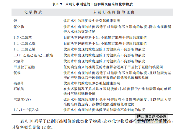 表8.9列舉了尚未制訂準(zhǔn)則值的來(lái)源于工業(yè)和居民區(qū)活動(dòng)的化學(xué)物質(zhì),并在表中說(shuō)明 了理由,其資料概覽見第12章。