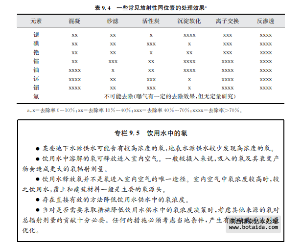 鈾、鐳以及氡都溶解于水。地表水(如江河湖泊)中含有氡,在水流過巖石和土壤過程中 易因攪動(dòng)作用釋放到大氣中。泉水和井水等地下水通常比地表水含有更高的氡,在比較極端的情況下,這類水源作為飲用水供應(yīng)可能含有極高含量的氡(見專欄9.5)。