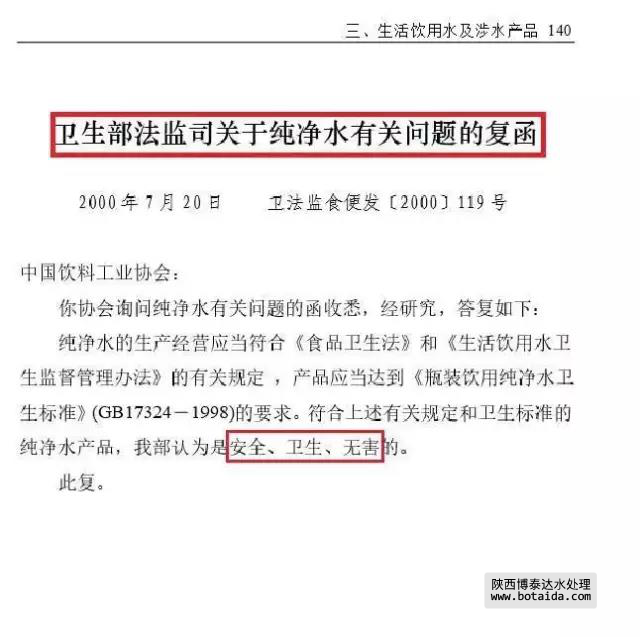 2000年7月20日,衛(wèi)生部衛(wèi)生法制與監(jiān)督司在給中國飲料工業(yè)協(xié)會(huì)的復(fù)函中說,純凈水“是安全,衛(wèi)生,無害的”。