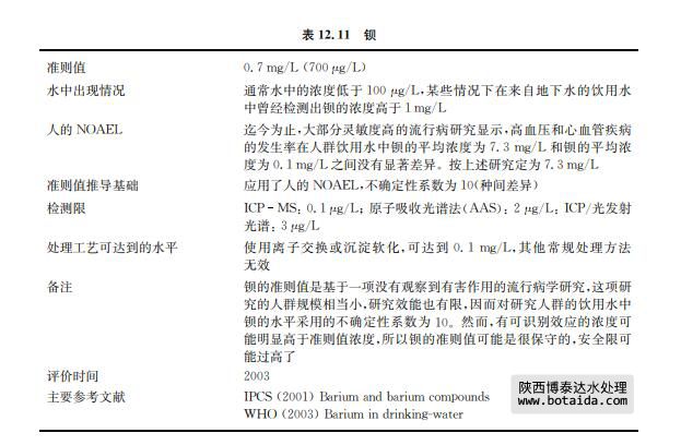 鋇作為一種微量元素存在于火成巖、水成巖中,其化合物有多種工業(yè)用途。但是水中的 鋇多來(lái)自自然界。非職業(yè)性的暴露主要通過(guò)攝入食物中的鋇。然而,當(dāng)水中鋇濃度高時(shí),飲 用水可能對(duì)鋇的總攝入量起到重要影響(見(jiàn)表12.11)。