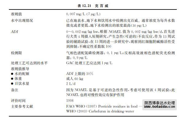 克百威(CASNo.1563 66 2)作為一種在世界各地廣泛使用的農(nóng)藥,對(duì)多種農(nóng)作物起 作用。噴灑于作物上的克百威殘留量通常非常低或低于檢測(cè)限(見(jiàn)表12.21)??税偻睦?化性質(zhì)以及現(xiàn)有的少量資料顯示,來(lái)自地下水和地面水源的飲用水可能是克百威的主要攝 入途徑。