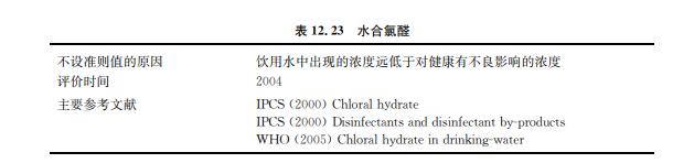 水合氯醛或者三氯乙醛是當(dāng)水中含有有機(jī)前體物(如富里酸和腐殖酸)時,生成的氯 化消毒副產(chǎn)物(見表12.23)。有研究發(fā)現(xiàn)它在飲用水中的濃度可高達(dá)100μg/L,但是通 常濃度低于10μg/L。一般地表水中的濃度高于地下水,其濃度在水的輸送過程中可能會 增高。