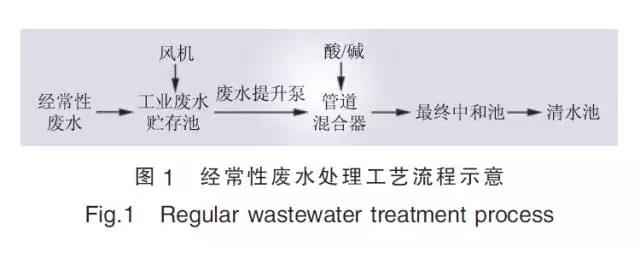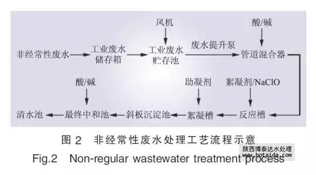 非經(jīng)常性廢水處理系統(tǒng)工藝流程如圖2所示, 調(diào)整pH值后的廢水先后經(jīng)過(guò)反應(yīng)槽、絮凝槽完成凝聚、絮凝反應(yīng), 然后進(jìn)入斜板沉淀池完成絮凝體與水的分離。沉淀池上部的清水自流進(jìn)入最終中和池進(jìn)行pH值調(diào)整, 最終出水流入清水池, 與經(jīng)常性廢水匯總。