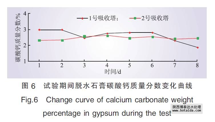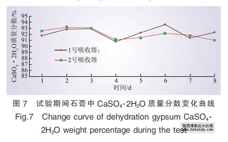 根據(jù)計(jì)劃進(jìn)行臨時(shí)管路系統(tǒng)安裝, 從原工業(yè)廢水系統(tǒng)清水池清水泵出口母管直接引出一路管道至1、2號(hào)脫硫塔間的地坑。由電廠原有的坑泵將處理后的工業(yè)廢水輸送入脫硫塔工藝用水點(diǎn), 同時(shí)在管路上增設(shè)電動(dòng)調(diào)節(jié)閥和電磁流量計(jì)。首次補(bǔ)入地坑120 m3處理后的工業(yè)廢水, 待地坑內(nèi)坑泵開(kāi)啟將其輸送至脫硫系統(tǒng)后, 監(jiān)測(cè)脫硫塔脫硫效率、石膏品質(zhì)變化; 在脫硫塔脫硫效率、石膏品質(zhì)穩(wěn)定無(wú)變化的情況下, 逐步補(bǔ)入處理后的工業(yè)廢水, 并以10 m3/d的梯度逐漸增加。若石膏品質(zhì)明顯下降, 則加大監(jiān)測(cè)頻率, 分析原因, 同時(shí)停止補(bǔ)入處理后的工業(yè)廢水。在調(diào)試好相關(guān)設(shè)備和儀表后開(kāi)始進(jìn)行試驗(yàn)分析, 內(nèi)容包括脫硫系統(tǒng)整體運(yùn)行狀況、脫硫效率、石膏品質(zhì)等。