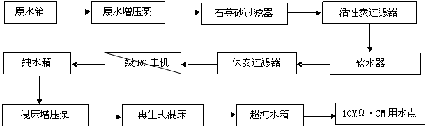 6、原水箱→原水增壓泵→石英砂過濾器→活性碳過濾器→軟水器→保安過濾器→反滲透系統(tǒng)→純水箱→混床增壓泵→超純水箱→10MΩ.CM用水點(diǎn)