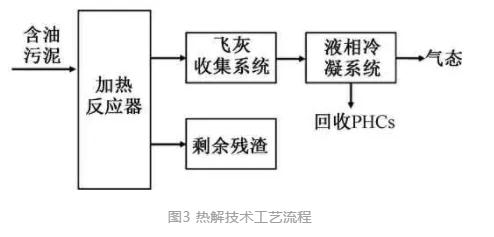 在無氧條件下,含油污泥經(jīng)高溫?zé)峤廪D(zhuǎn)化為氣、液、固三相,氣相產(chǎn)品以CH4、CO2、H2和CO為主,液相一般為常溫燃油和水,固相殘?jiān)泻薪固?,一般以回收液態(tài)PHCs為主,可不調(diào)質(zhì)達(dá)到回收目的。熱解反應(yīng)在還原氣氛下進(jìn)行,產(chǎn)二噁英極少,其典型工藝流程如圖3所示。