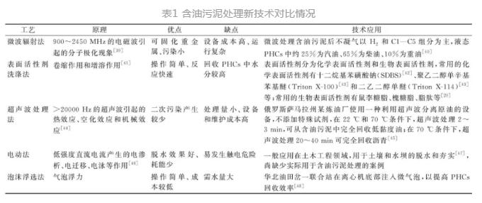 其他技術(shù)主要包括微波輻射法、表面活性劑洗滌法、超聲波處理法、電動(dòng)法、泡沫浮選法等,尚處于實(shí)驗(yàn)室研究階段,具體對(duì)比情況見表1。