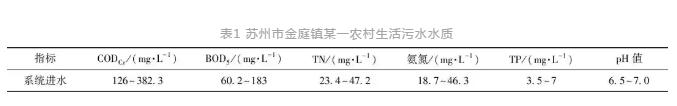 采用鐵碳-砂濾組合進行強化除磷,相比化學法,操作簡單,維護量小,從而為鐵碳-砂濾的深度除磷工藝在農(nóng)村生活污水中的應用,一級脫氮除磷強化提供解決思路。為分析鐵碳-砂濾除磷工藝實際工程中的除磷效果,將該工藝應用于蘇州市金庭鎮(zhèn)某一農(nóng)村生活污水處理項目。該項目污水處理系統(tǒng)采用固定床生物膜工藝,為防止鐵碳板結(jié)鈍化,裝置通過特殊結(jié)構(gòu)設計,通過機械方法使鐵碳運動,互相摩擦去除氧化膜,避免長時間電解過程中陽極鈍化及鐵碳板結(jié)問題。項目區(qū)生活污水水質(zhì)情況如表1所示。